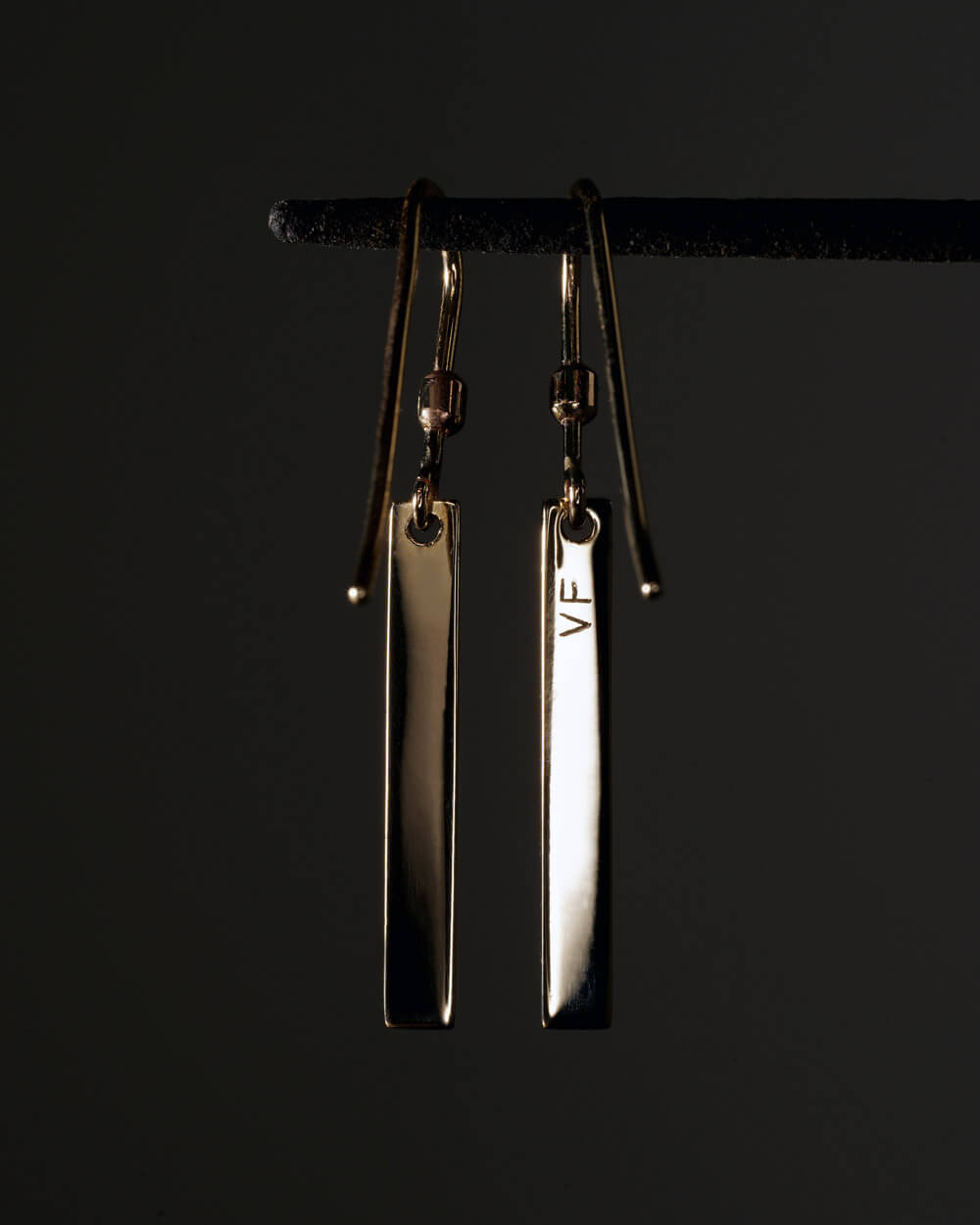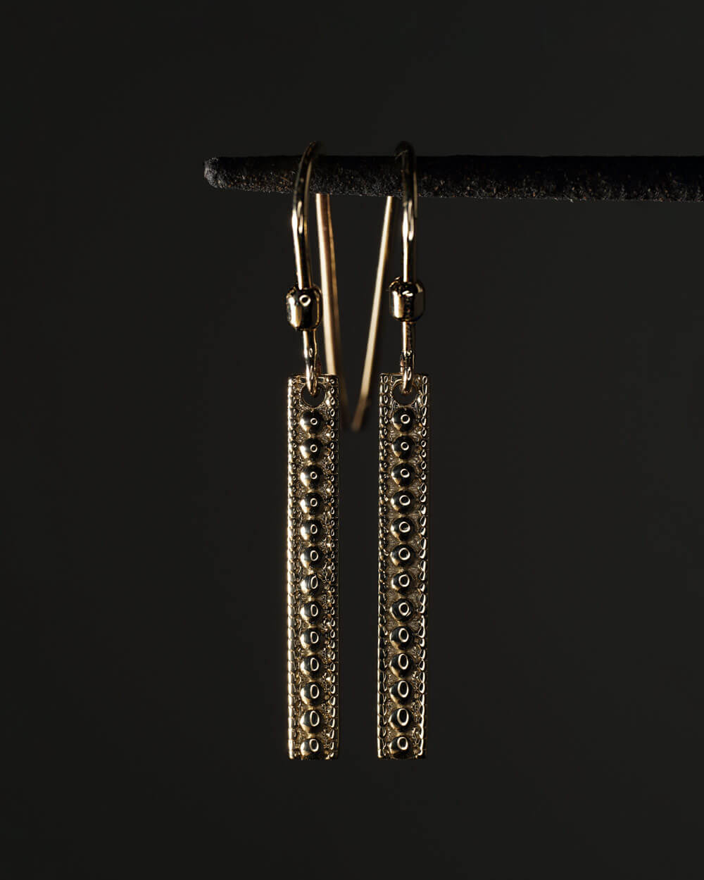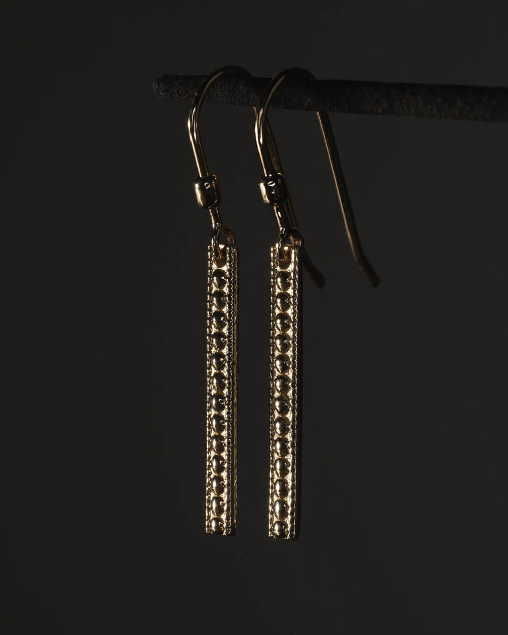 Naušnice Ares izrađene su od 9-karatnog zlata, u obliku izdužene pločice s tri reda millgrain uzorka.