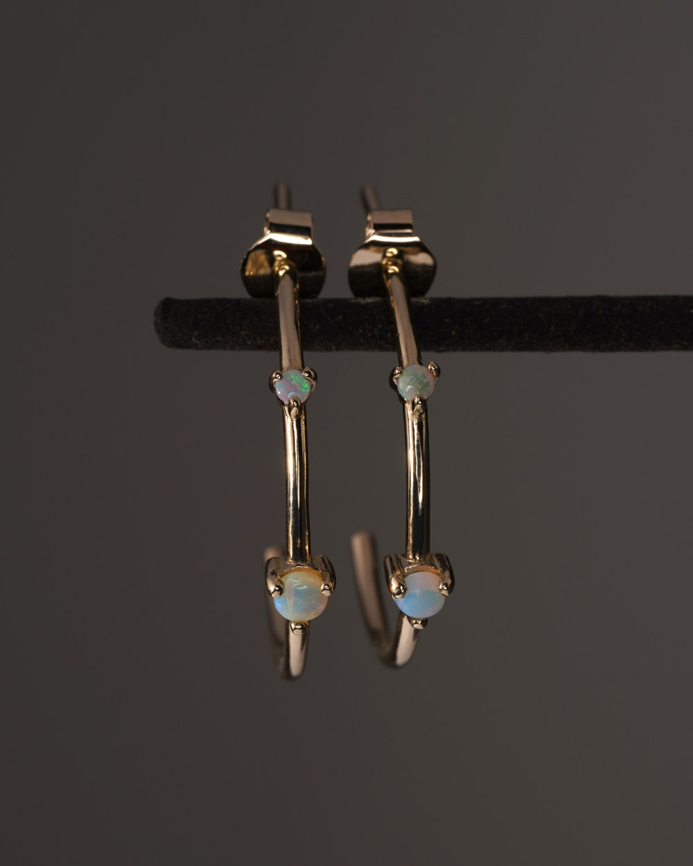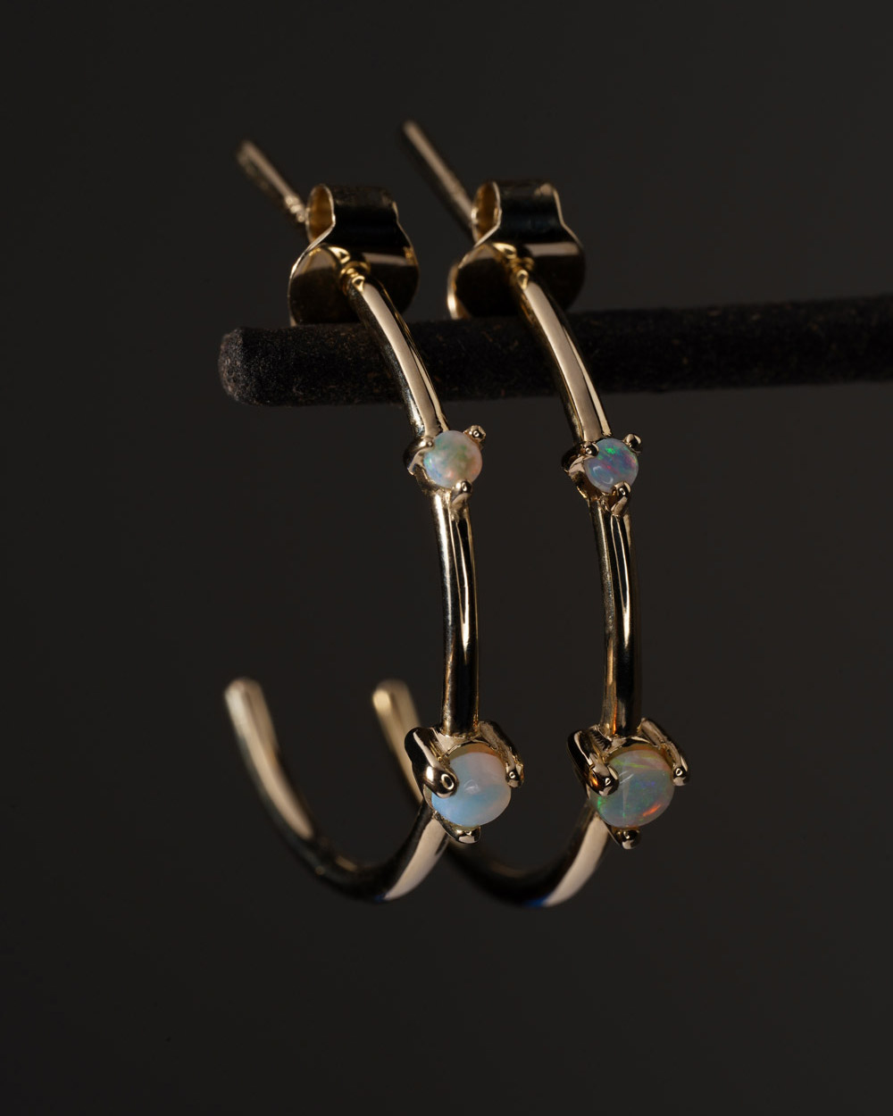 Izrađene su od 9-karatnog zlata, a ukrašene prirodnim opalima bijele i bijelo-plave boje. Svaka naušnica sadrži dva kamena, promjera 1.8 mm i 2.8 mm, koji su ručno postavljeni. Promjer naušnica je 22 mm.