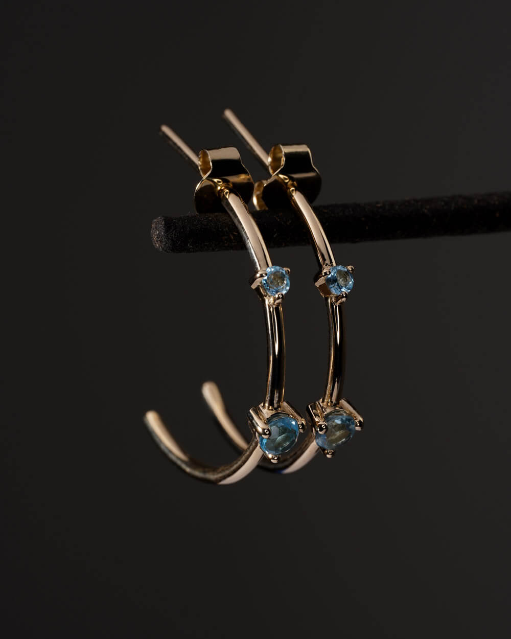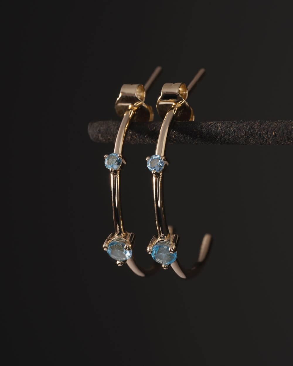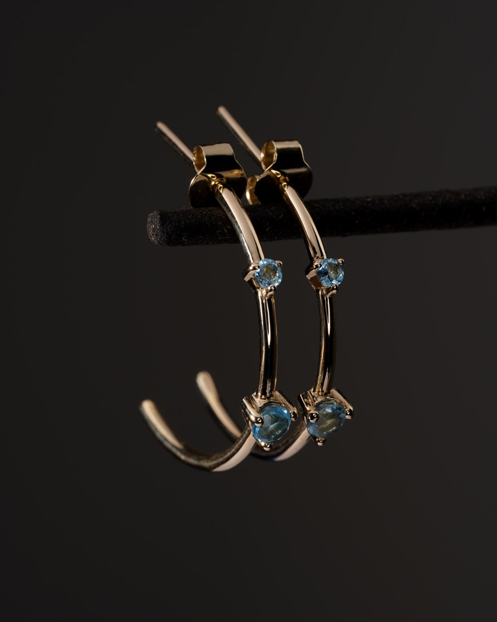 Izrađene su od 9-karatnog zlata i ukrašene plavim topazima. Svaka naušnica sadrži dva kamena, promjera 2 mm i 3 mm, koji su ručno postavljeni. Promjer naušnica je 22 mm.