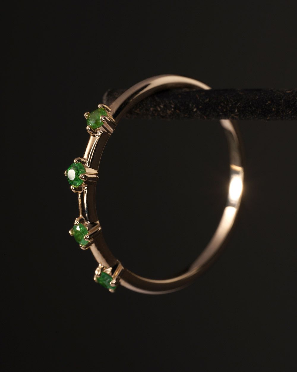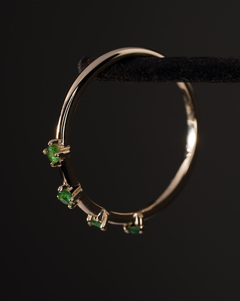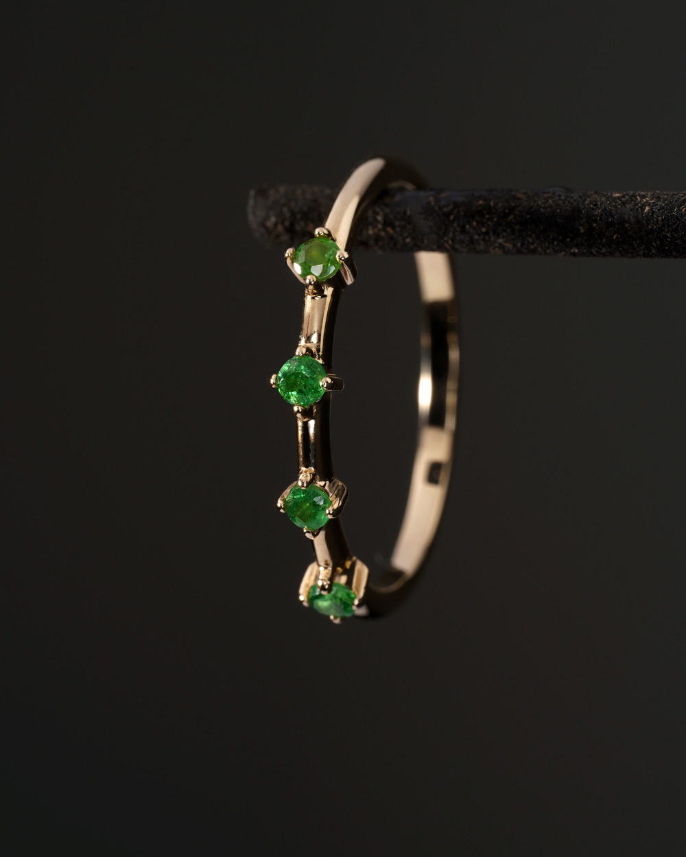 Nazvan po zvijezdi Bellatrix, velikoj plavoj zvijezdi zviježđa Orion, ovaj prekrasan prsten donosi istu privlačnost i sjaj kao i njegovo nebesko ime. Izrađen je od 9-karatnog zlata i četiri intenzivno zelena granata tsavorita, promjera 2mm.