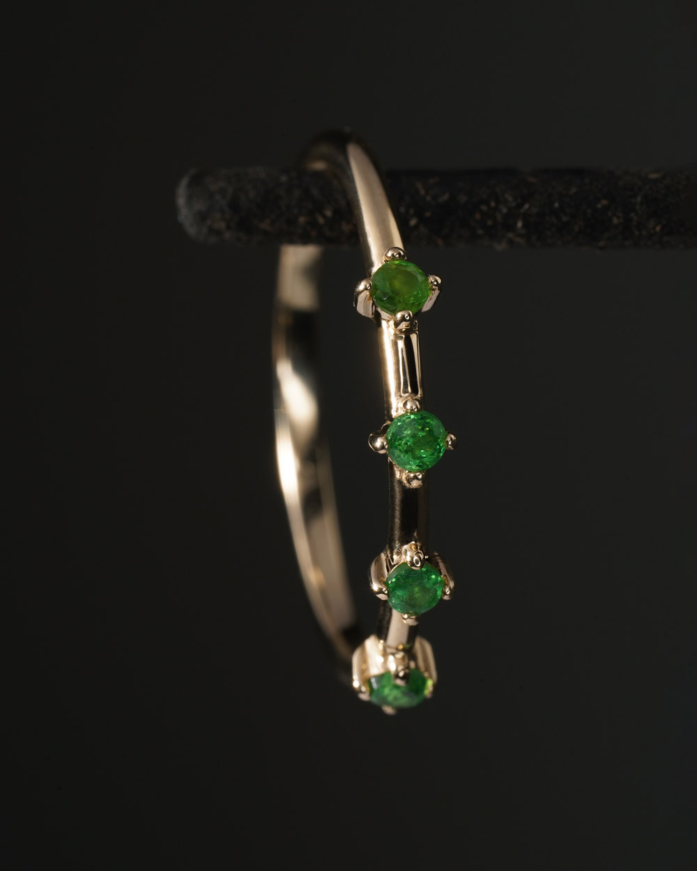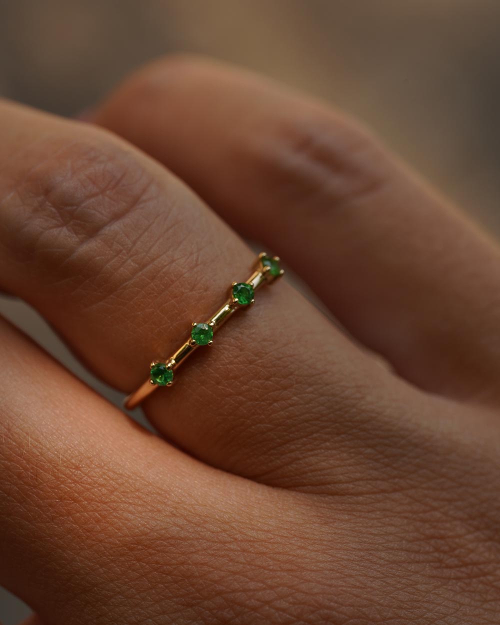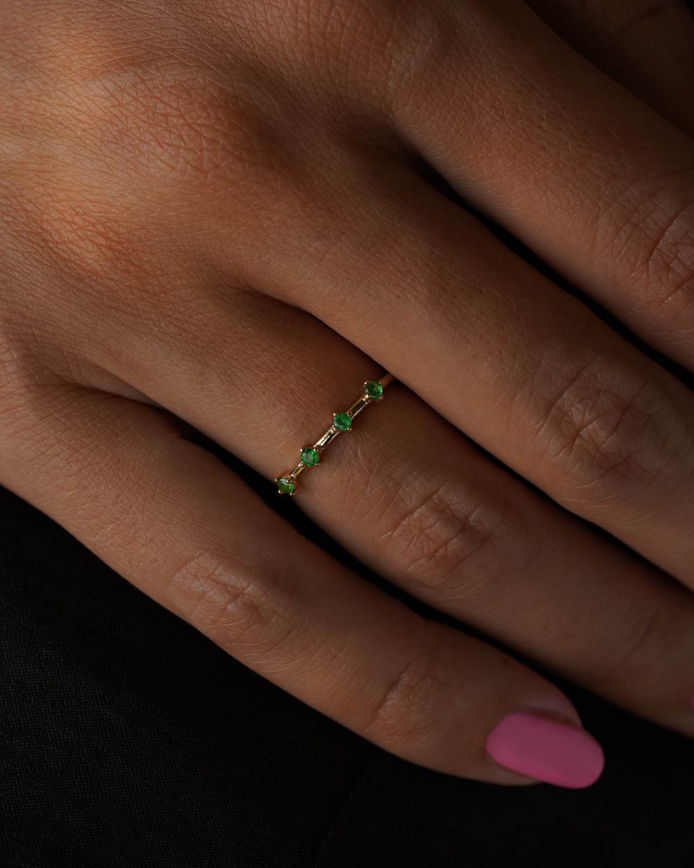 Nazvan po zvijezdi Bellatrix, velikoj plavoj zvijezdi zviježđa Orion, ovaj prekrasan prsten donosi istu privlačnost i sjaj kao i njegovo nebesko ime. Izrađen je od 9-karatnog zlata i četiri intenzivno zelena granata tsavorita, promjera 2mm.