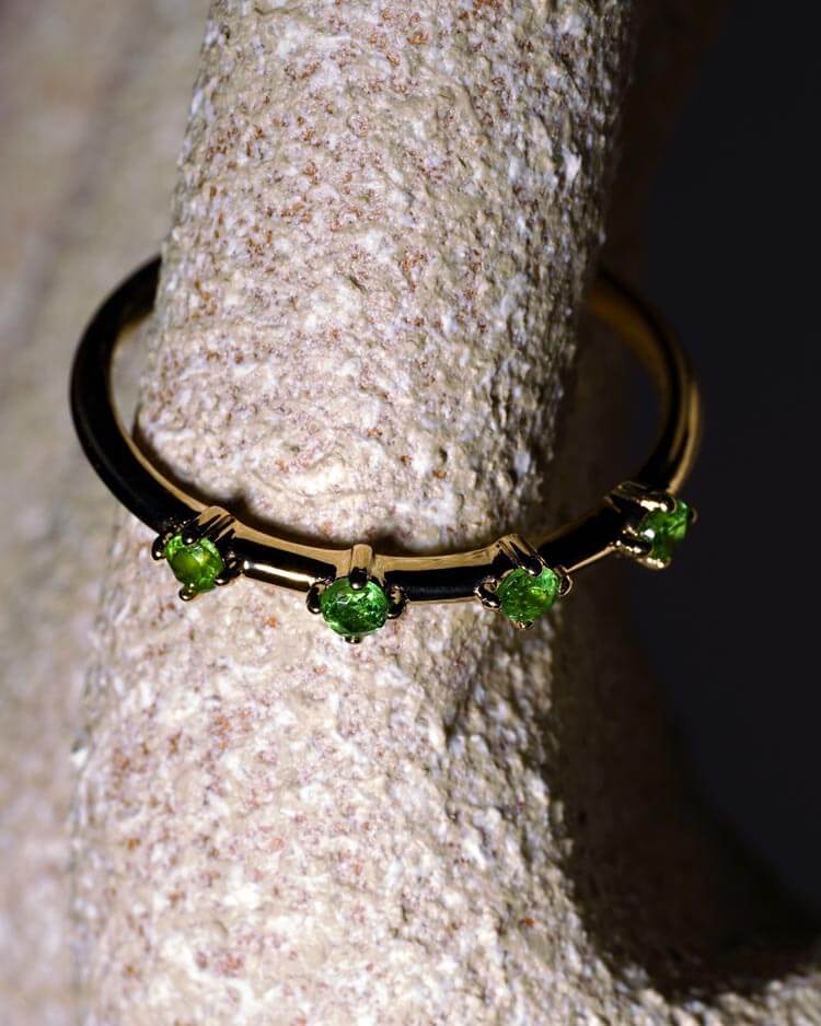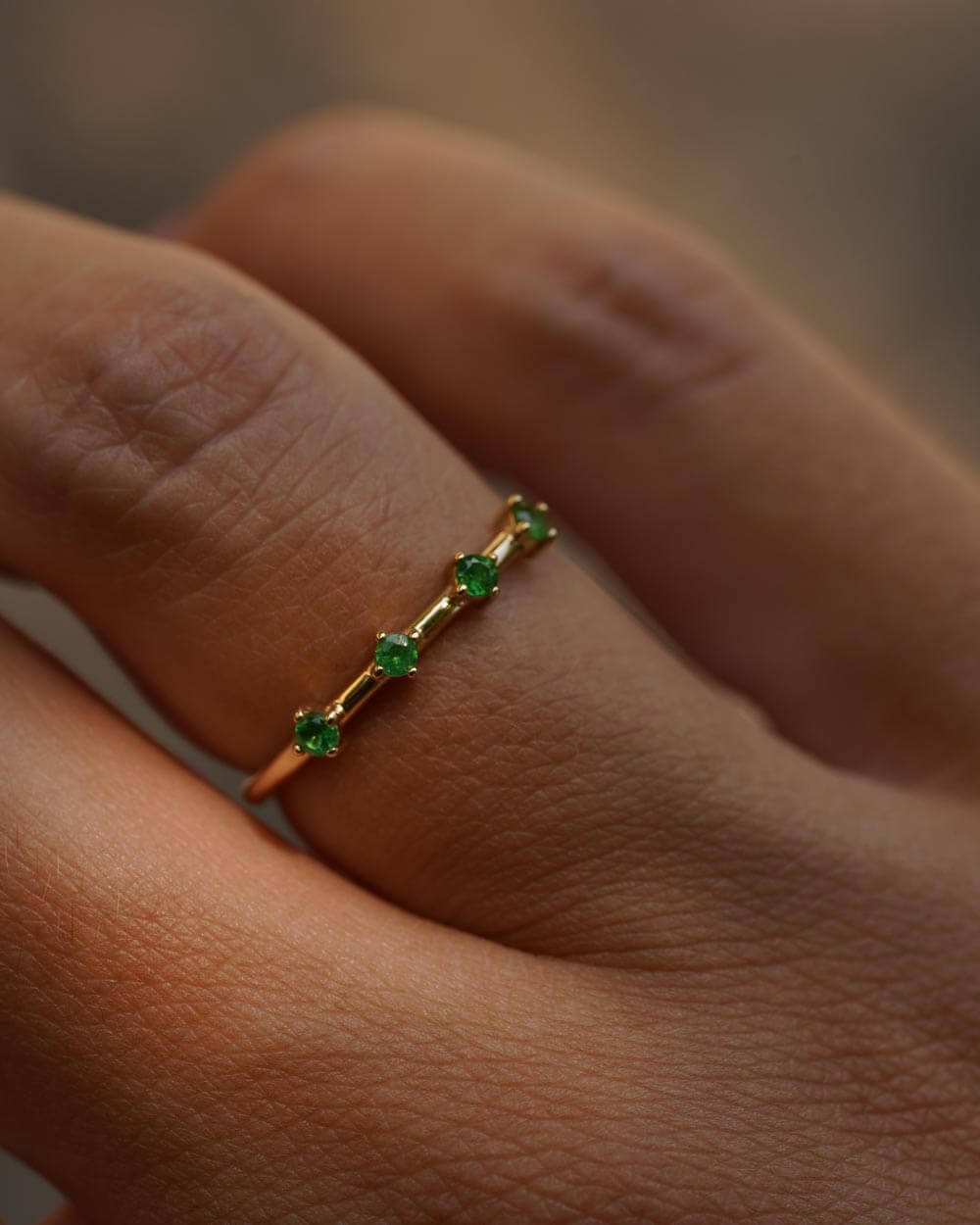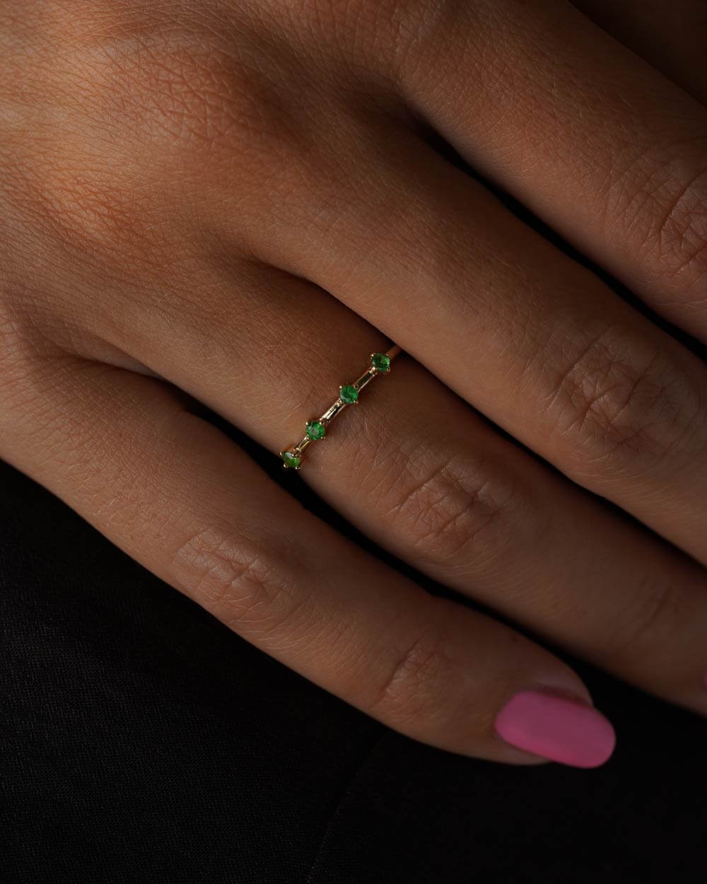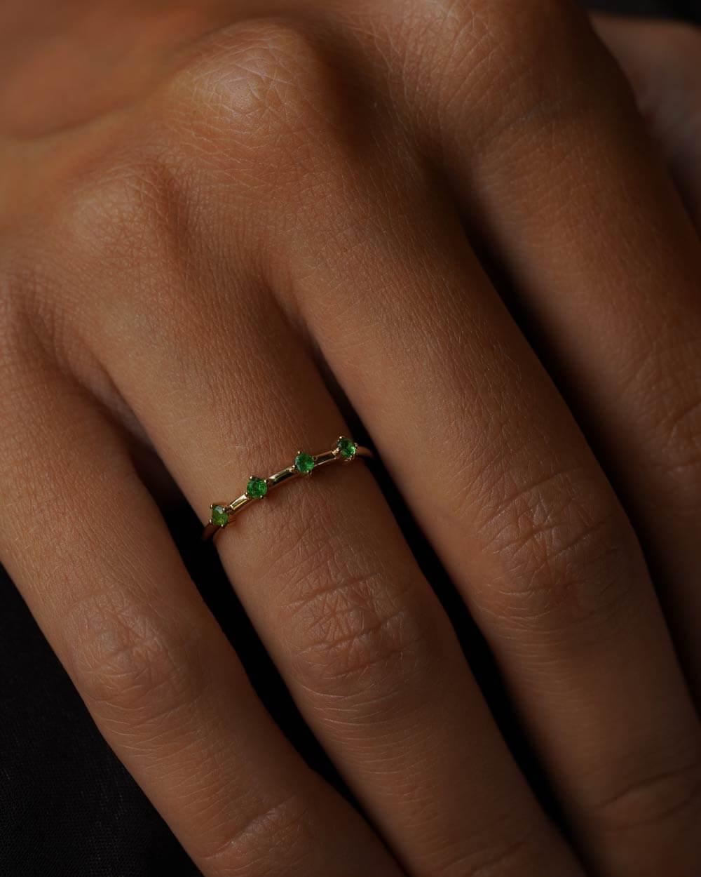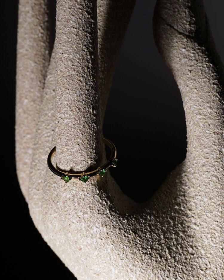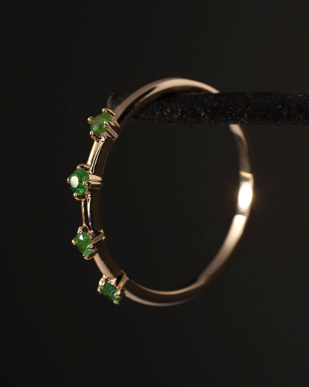 Nazvan po zvijezdi Bellatrix, velikoj plavoj zvijezdi zviježđa Orion, ovaj prekrasan prsten donosi istu privlačnost i sjaj kao i njegovo nebesko ime. Izrađen je od 9-karatnog zlata i  četiri intenzivno zelena granata tsavorita, promjera 2mm.