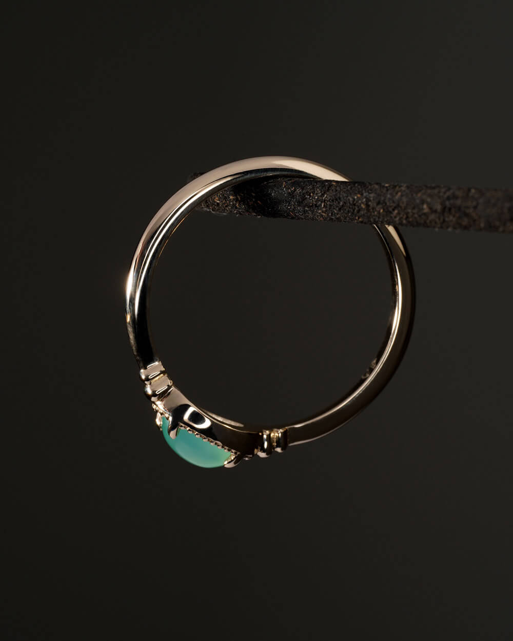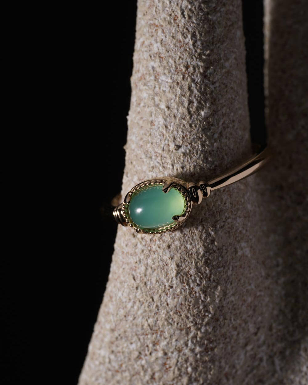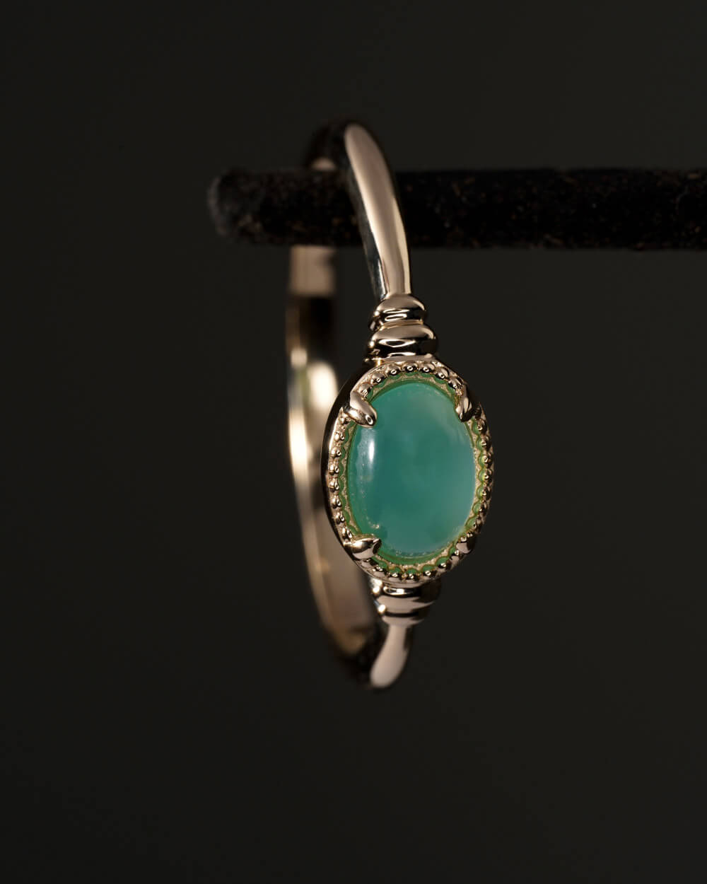 Prsten Vega izrađen je od 9-karatnog zlata i ukrašen prirodnim krizoprasom ovalnog oblika, veličine 6 × 4 mm.