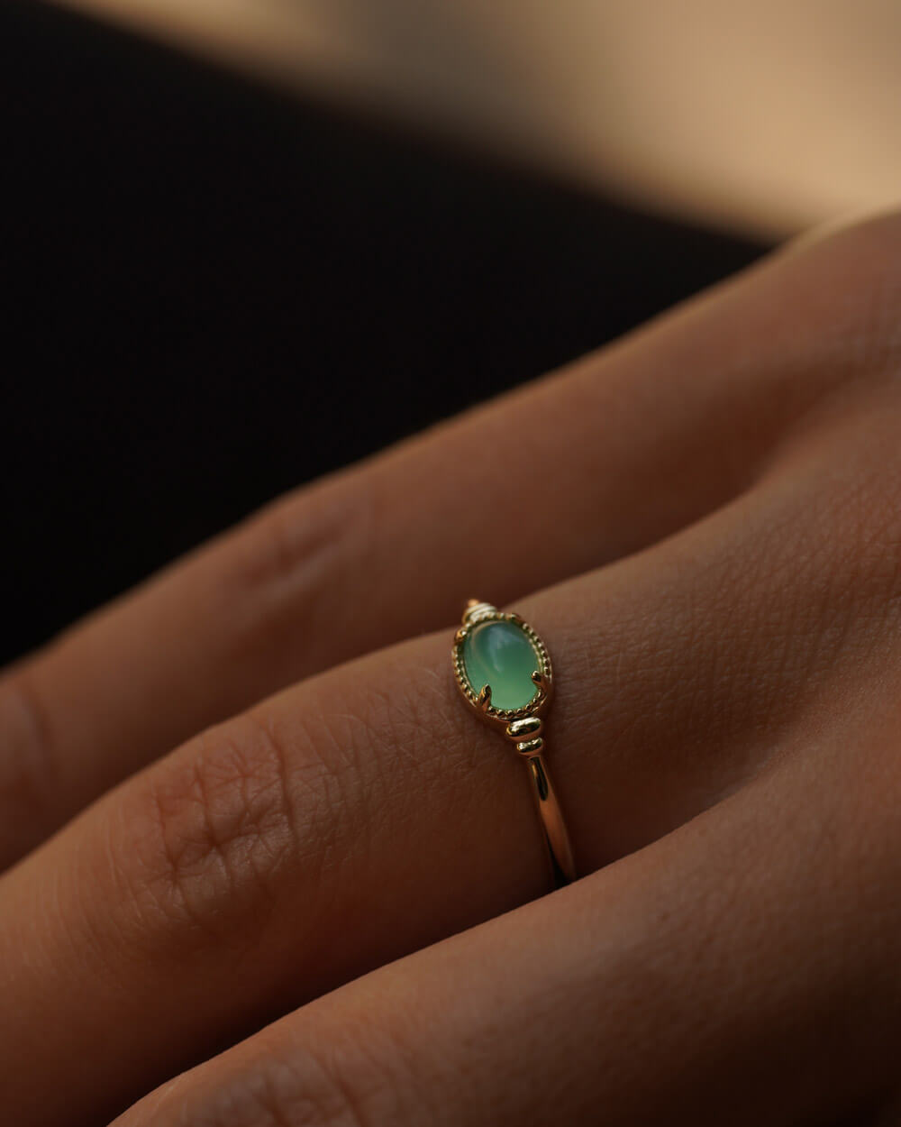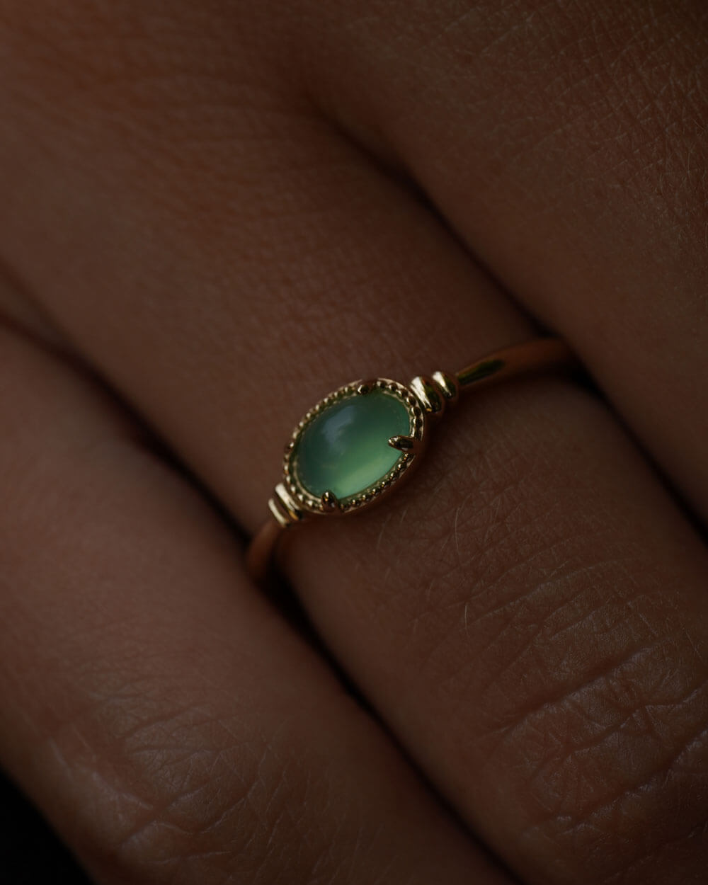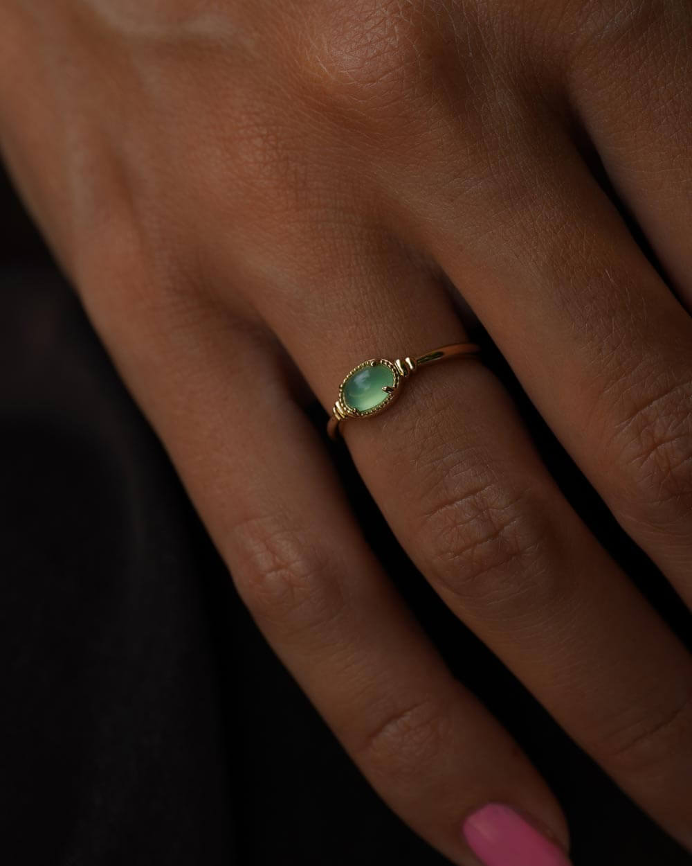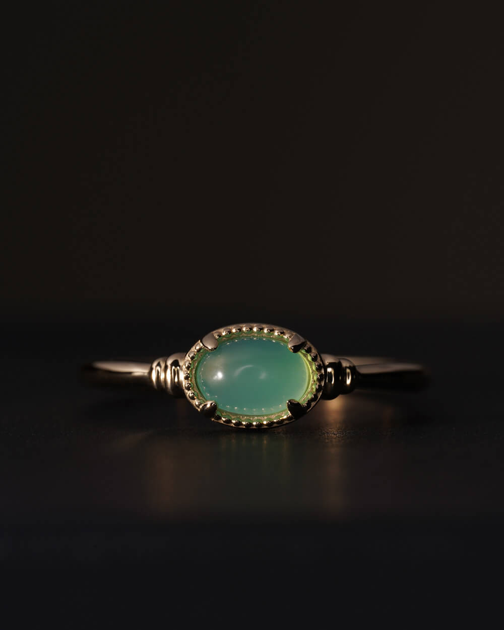 Prsten Vega izrađen je od 9-karatnog zlata i ukrašen prirodnim krizoprasom ovalnog oblika, veličine 6 × 4 mm.