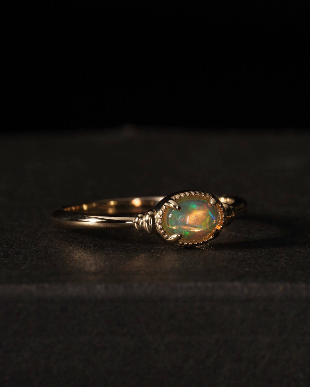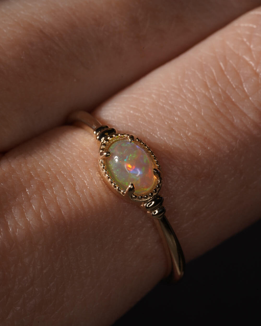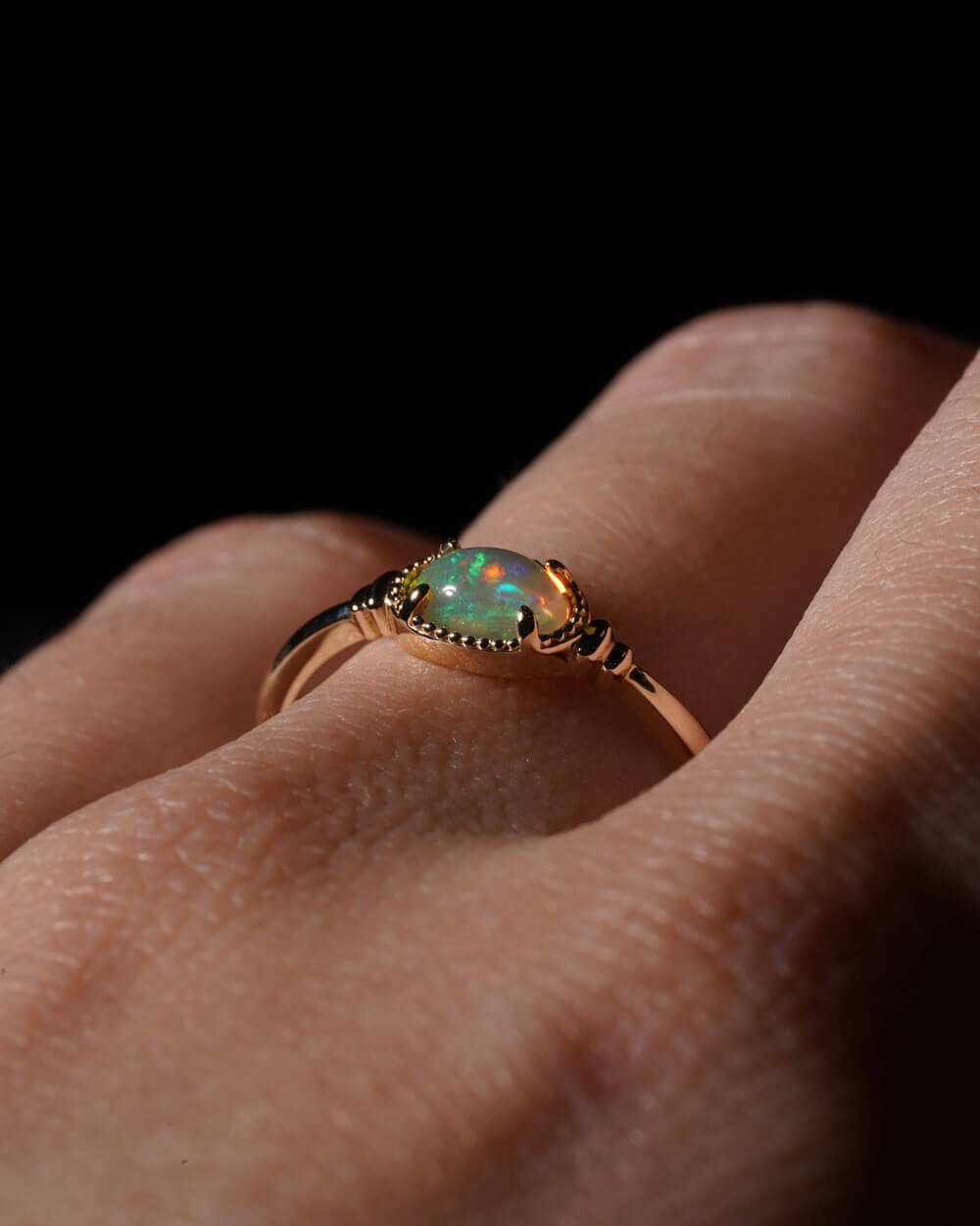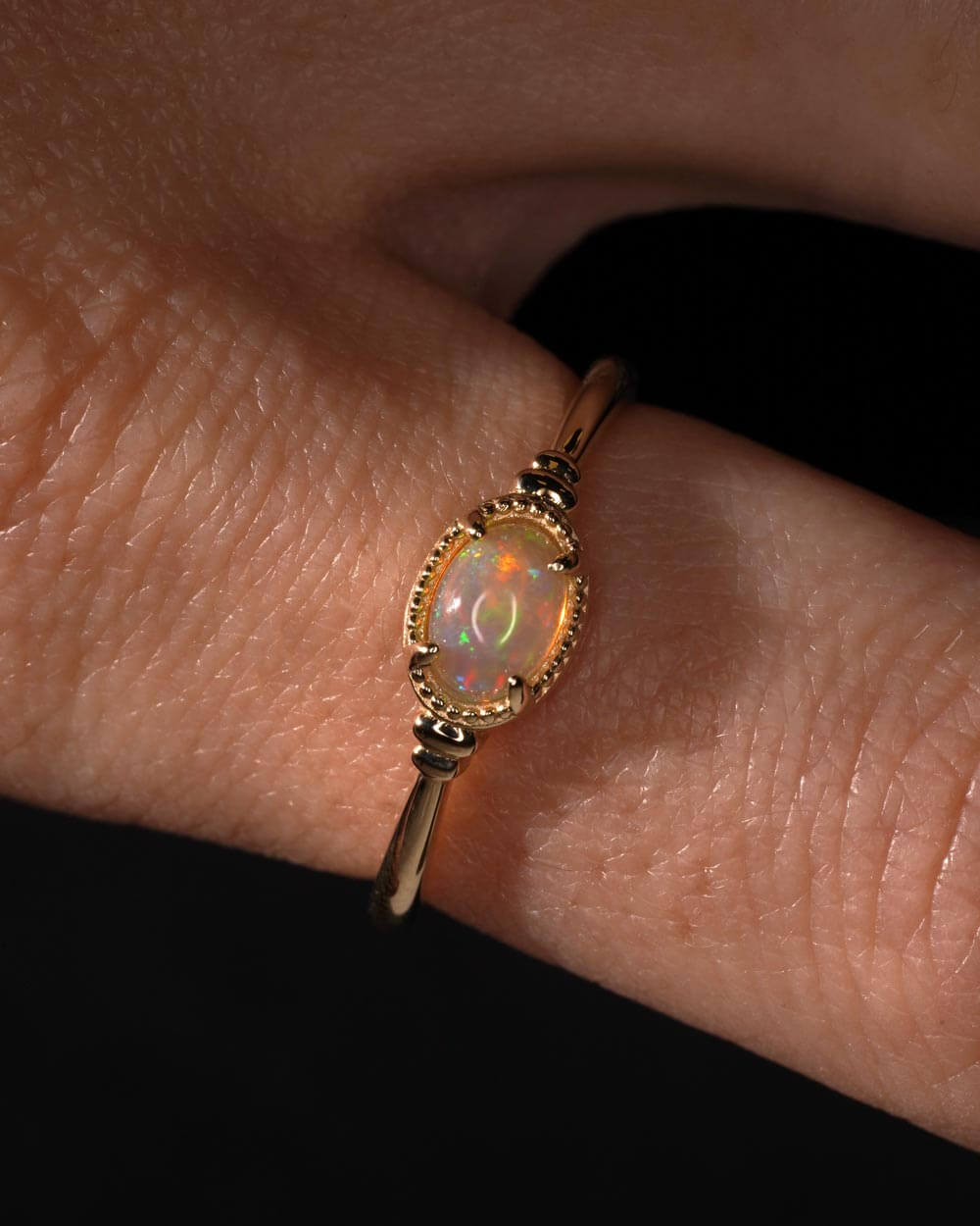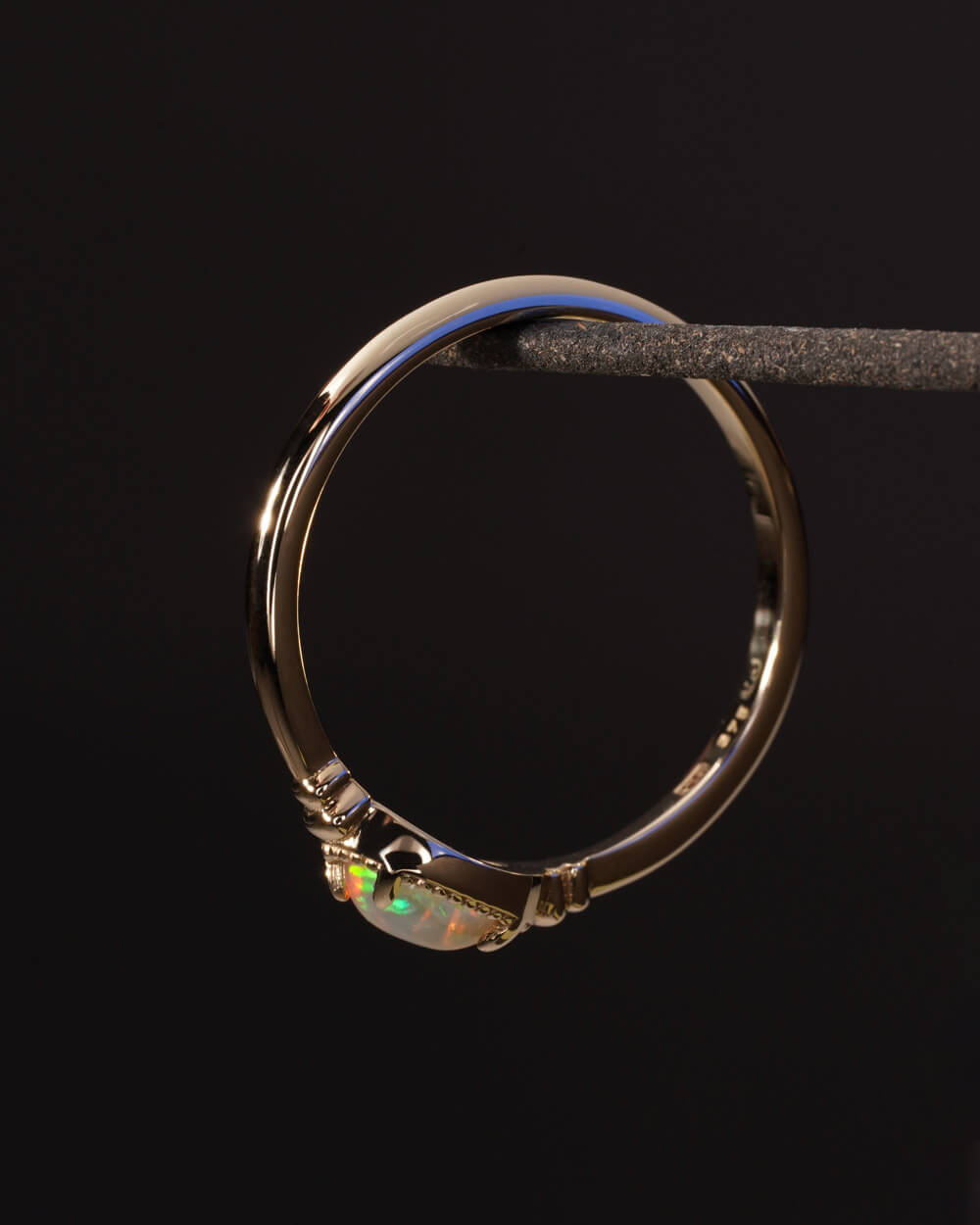 Prsten Vega izrađen je od 9-karatnog zlata i ukrašen prirodnim etiopijskim opalom ovalnog oblika, veličine 6 × 4 mm.